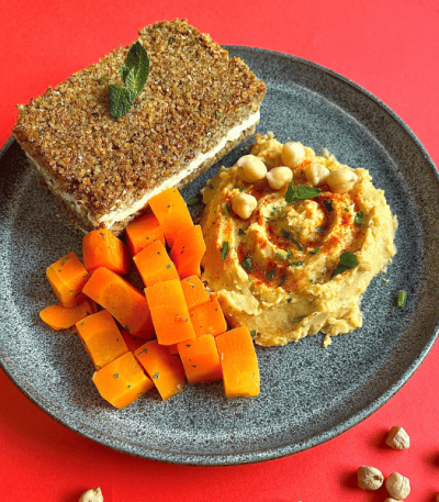 Vegetarian Aubergine Kibbeh with Carrots & Chickpea Hummus (Kcal 335)